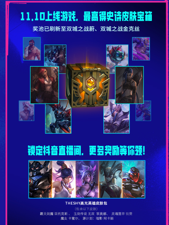 锁定直播间,TheShy高光英雄皮肤包、史诗皮肤随机宝箱、TheShy签名照等豪华大礼将不定期掉落,让你的观看体验更加刺激、更加难忘!